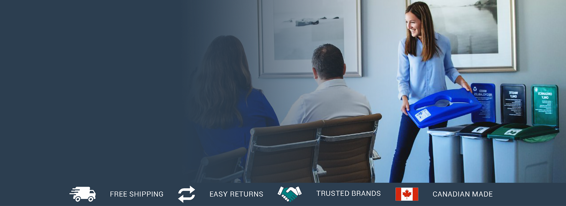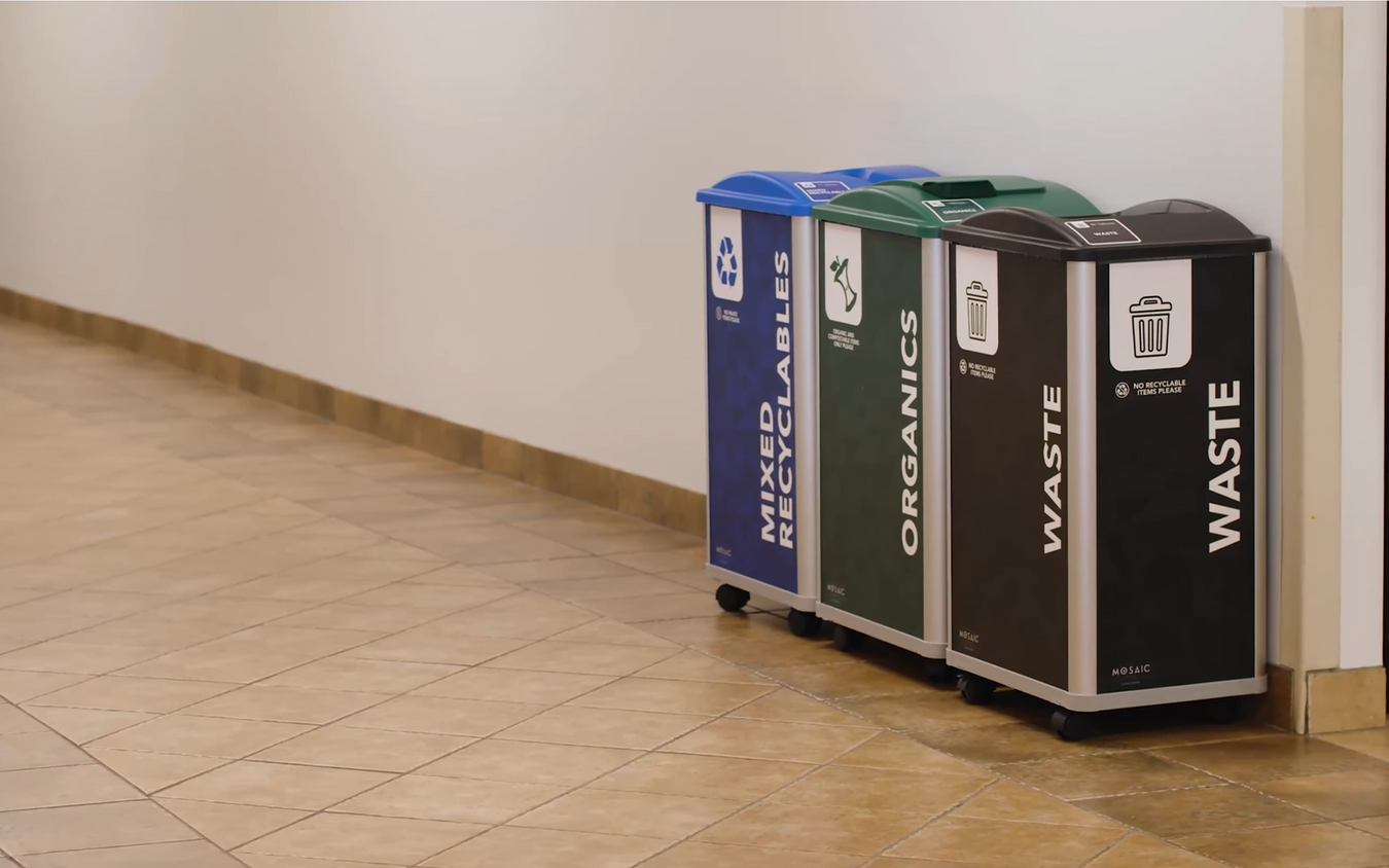 View full detailsBusch Systems Mosaic™ Triple Waste + Recycling + Organics Station – 363 Litre (96 Gallon / 3 × 32 Gal) – Silver/Black/Blue/Green – Item #209845 Co...